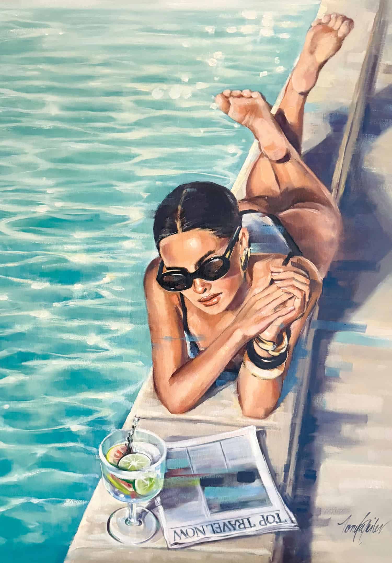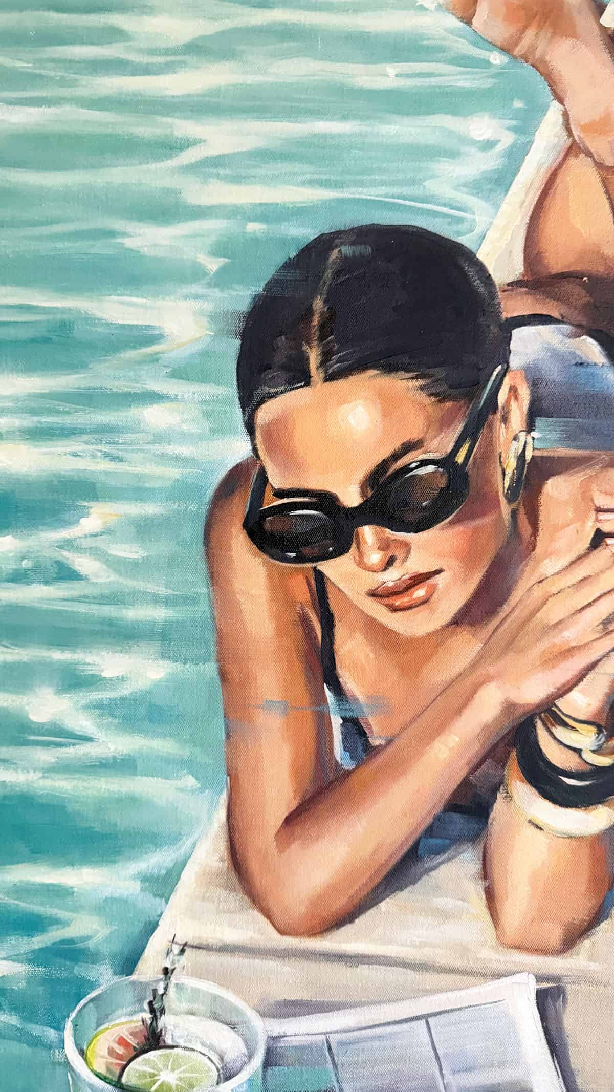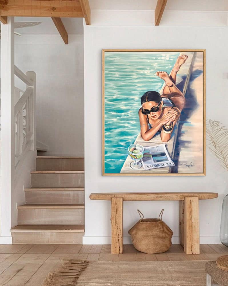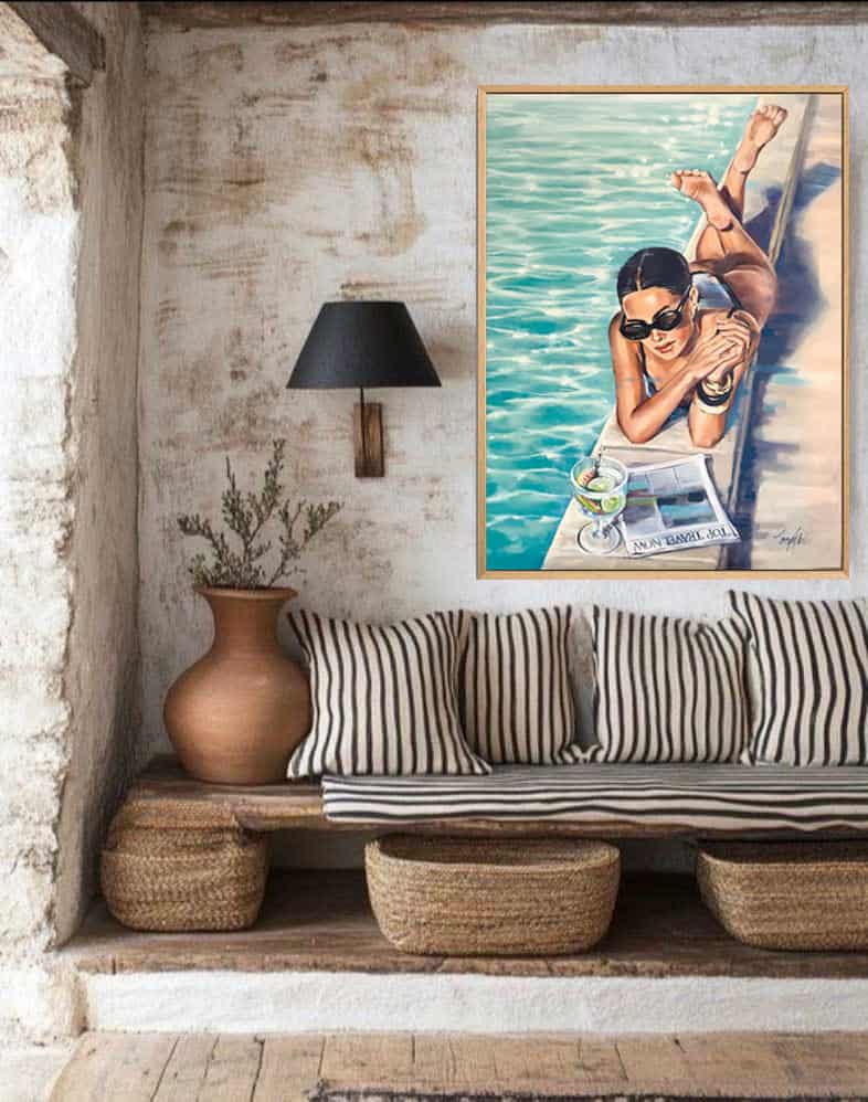 Painted in luminous aquamarine and warm skin tones, Poolside Reverie captures that rare moment of inhabiting your life fully. The shimmering pool, the cocktail, the folded newspaper — these are not props. They are permission. Permission to rest, to savour, to be exactly where you are.