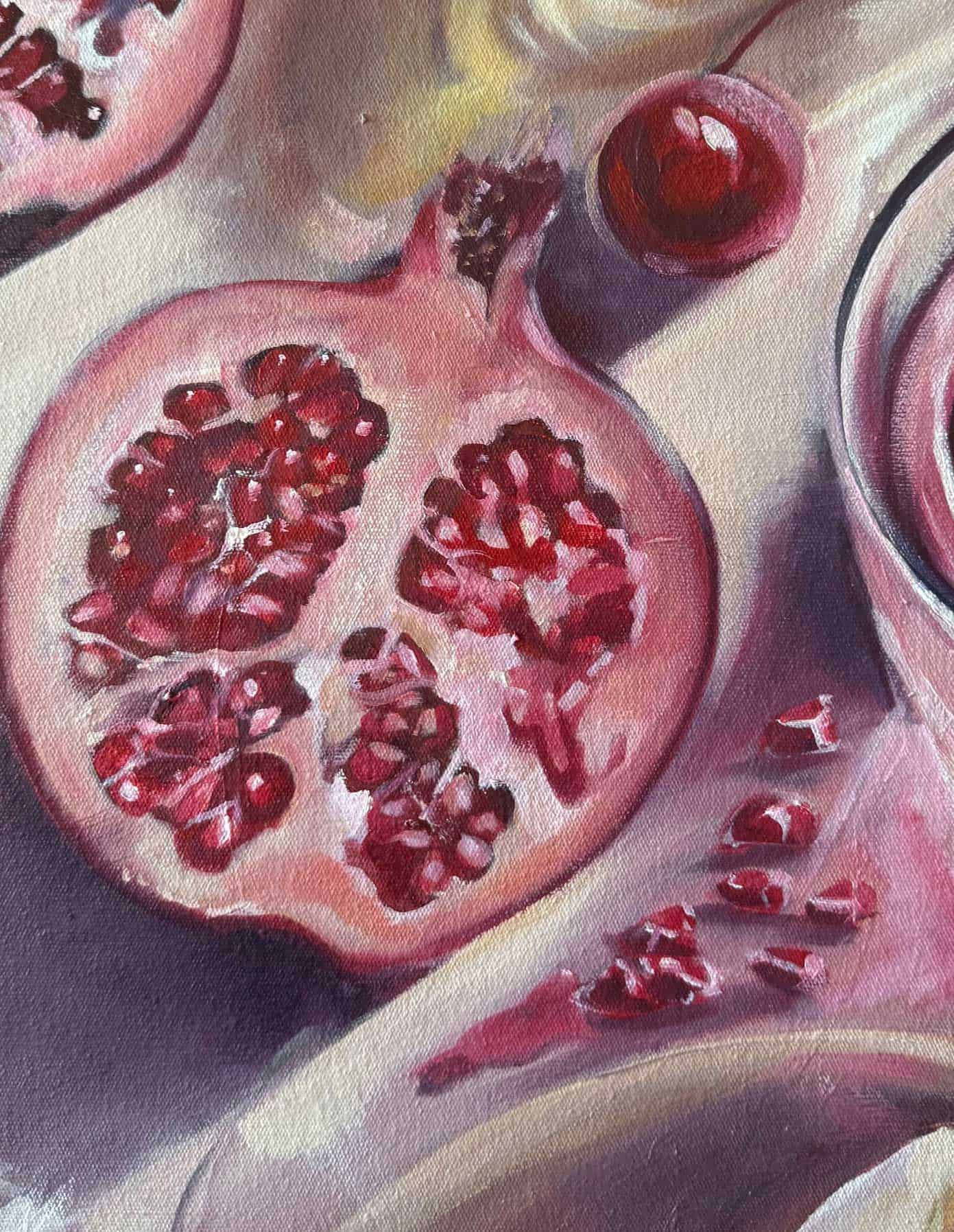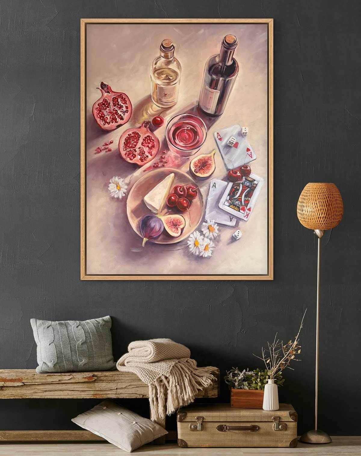 Good Fortune, wine and figs invites you into a moment of indulgence — an unhurried evening where wine is poured, fruit is shared, and luck is tested among friends. Rich pomegranates, ripe figs, and glossy cherries spill across the surface alongside playing cards and dice, blurring the line between a still life and a story waiting to unfold.
